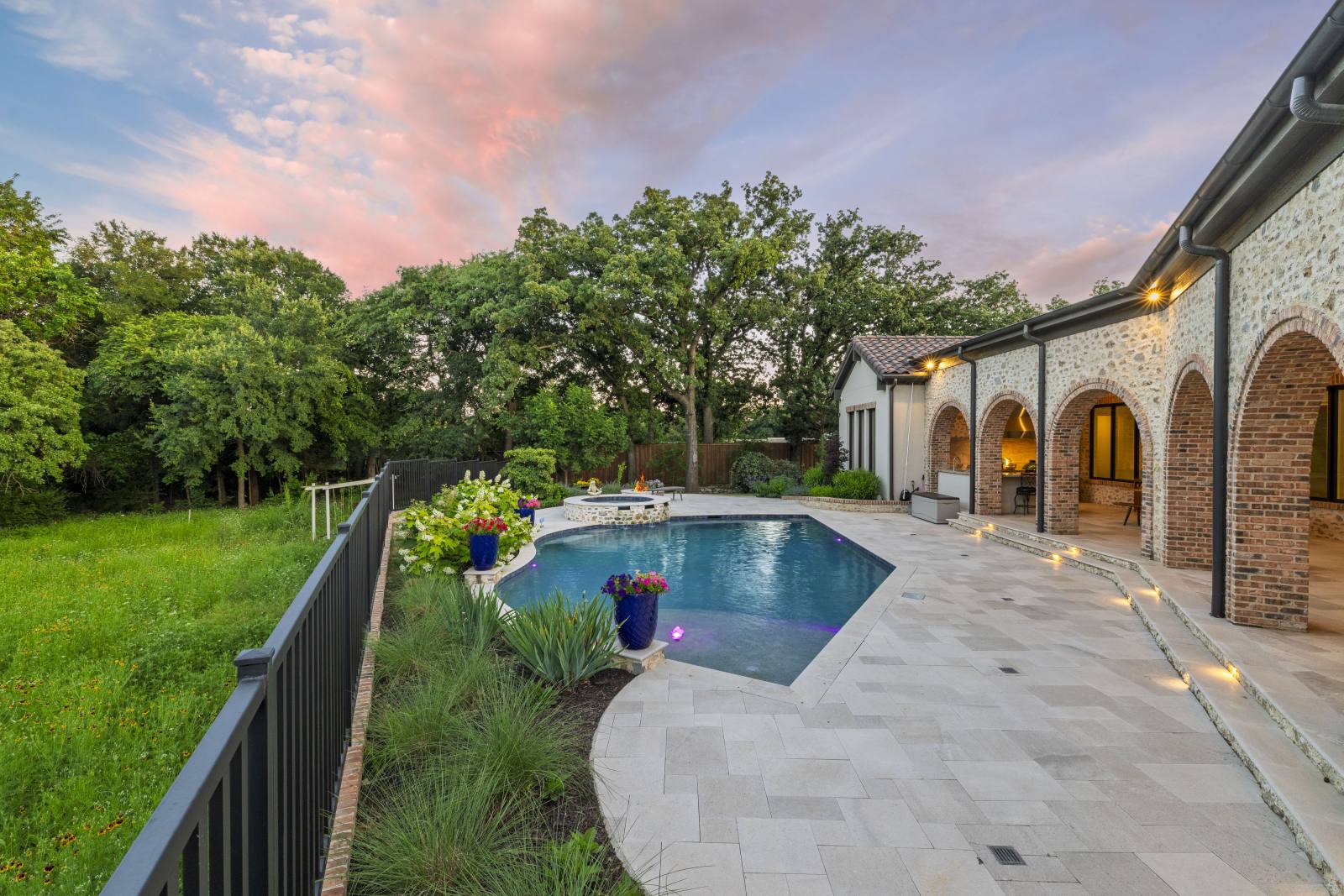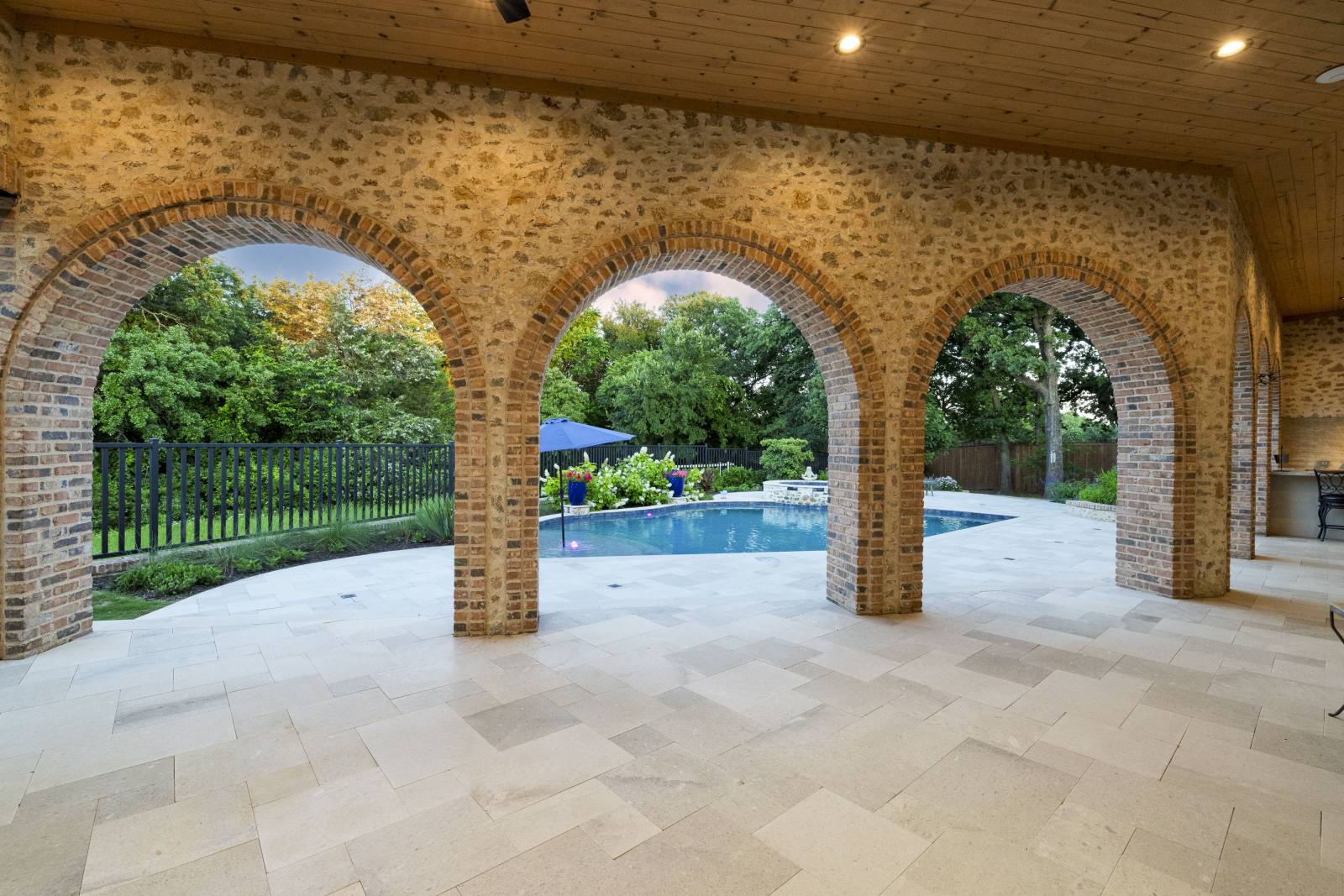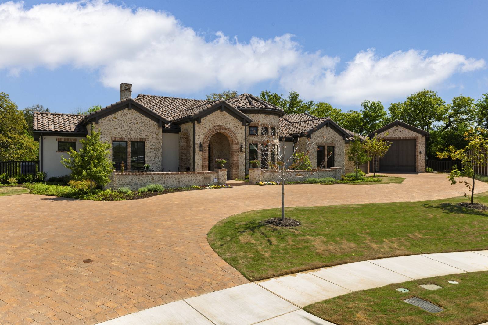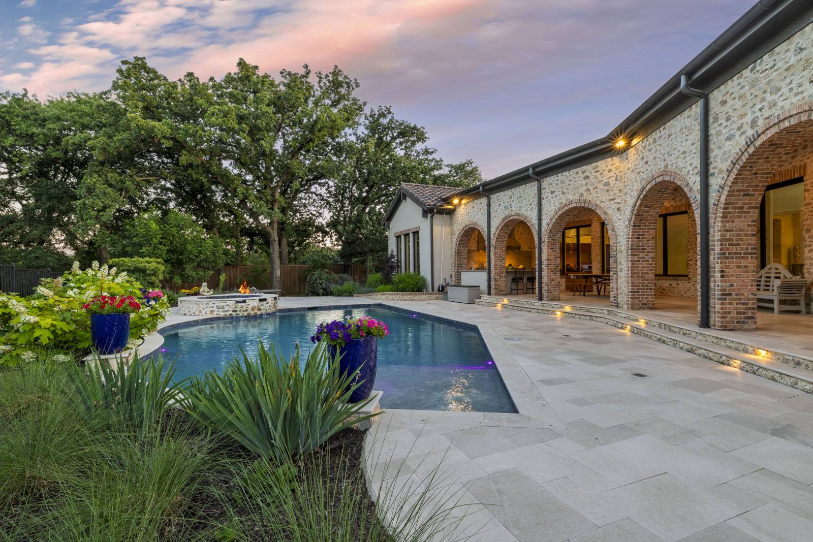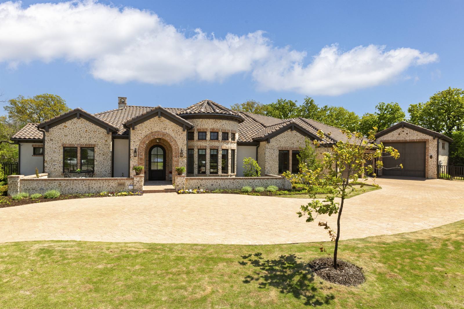 Nestled in the prestigious gated community of Stony Brook, this custom SCH award-winning Mediterranean estate offers 4,501 square feet of refined living space in a serene cul-de-sac backing to a greenbelt with no neighbors on one side. Designed for both elegance and comfort, the home features soaring ceilings, hand-scraped hardwood floors in living areas, and tile finishes throughout each of the six bathrooms. Four spacious bedrooms each include an ensuite bath, while a thoughtfully designed fourth garage bay with full bath accommodates an RV or flexible use. The open-concept kitchen and living area is the heart of the home, anchored by a large center island with breakfast bar and hidden storage. Culinary enthusiasts will appreciate the 7-burner gas cooktop, vent hood, built-in counter-depth refrigerator, and dishwasher. A separate prep kitchen with pantry, double Wolf ovens, microwave, and warming drawer ensures effortless entertaining. The formal dining room provides an elegant setting for gatherings, while the eat-in area overlooks the private backyard oasis. Outdoor living is elevated with a heated pool (with cover), heated spa, and tranquil water feature. The covered patio includes a fully equipped outdoor kitchen with commercial vent hood over the gas grill, complemented by a fire pit and convenient half bath. Modern amenities include owned solar panels with a 25-year transferable warranty and a smart home system controlling lighting, sound, security, fire suppression, and climate. The extra-deep three-car garage offers two prewired EV charging ports, while the fourth bay is designed for RV storage. Zoned for Keller ISD with open enrollment for Carroll ISD, this home combines award-winning craftsmanship, advanced technology, and resort-style amenities in one of the area’s most desirable communities. A rare opportunity to experience luxury, privacy, and convenience in perfect harmony.